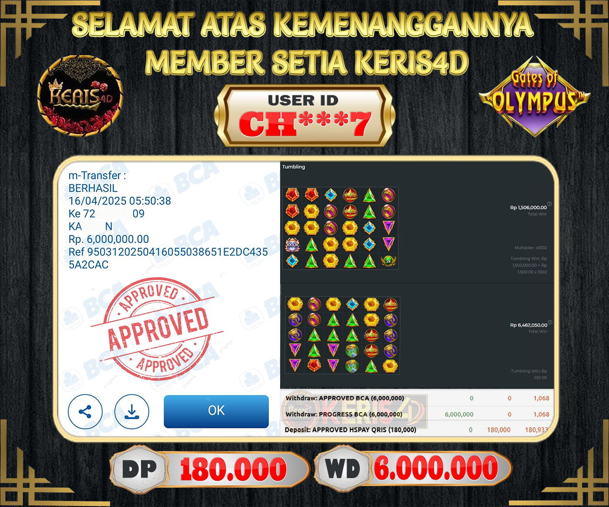 Setiap hari, member KERIS4D berhasil meraih jackpot besar dari berbagai provider slot ternama yang kami sediakan, seperti Pragmatic Play, Habanero, PG Soft, dan masih banyak lagi. Kami secara rutin menampilkan bukti screenshot atau rekapan kemenangan yang berhasil diraih, mulai dari kemenangan ratusan ribu hingga puluhan juta rupiah. Semua slip kemenangan ini kami hadirkan untuk membuktikan bahwa di KERIS4D, peluang menang itu nyata.