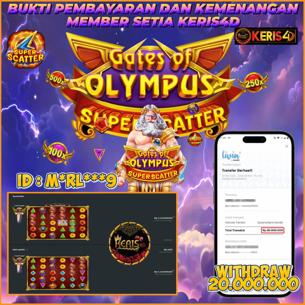 KERIS4D dikenal sebagai situs terpercaya yang selalu menghadirkan pengalaman bermain slot online yang aman, fair, dan berlisensi resmi. Di sini, kami tidak hanya sekadar memberikan janji, tapi bukti nyata berupa slip kemenangan yang dapat Anda lihat secara langsung.