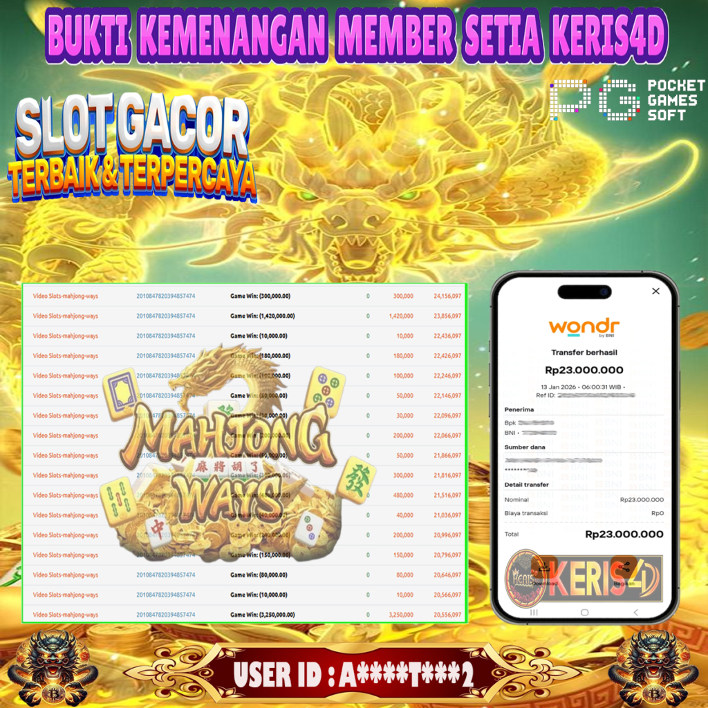 KERIS4D dikenal sebagai situs terpercaya yang selalu menghadirkan pengalaman bermain slot online yang aman, fair, dan berlisensi resmi. Di sini, kami tidak hanya sekadar memberikan janji, tapi bukti nyata berupa slip kemenangan yang dapat Anda lihat secara langsung.