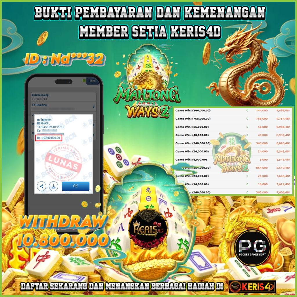 KERIS4D dikenal sebagai situs terpercaya yang selalu menghadirkan pengalaman bermain slot online yang aman, fair, dan berlisensi resmi. Di sini, kami tidak hanya sekadar memberikan janji, tapi bukti nyata berupa slip kemenangan yang dapat Anda lihat secara langsung.