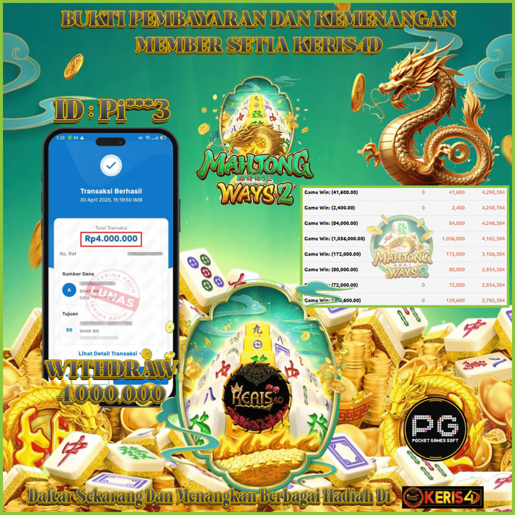 KERIS4D dikenal sebagai situs terpercaya yang selalu menghadirkan pengalaman bermain slot online yang aman, fair, dan berlisensi resmi. Di sini, kami tidak hanya sekadar memberikan janji, tapi bukti nyata berupa slip kemenangan yang dapat Anda lihat secara langsung.