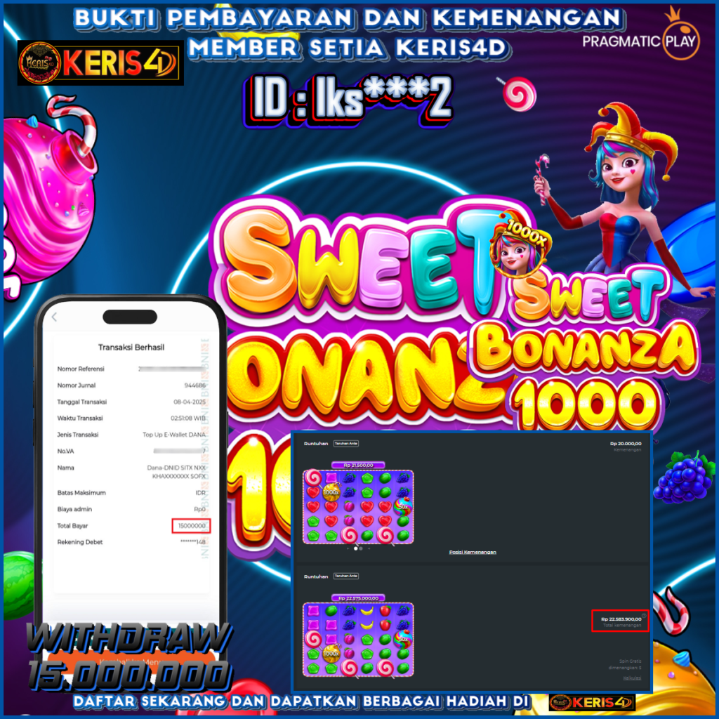 Setiap hari, member KERIS4D berhasil meraih jackpot besar dari berbagai provider slot ternama yang kami sediakan, seperti Pragmatic Play, Habanero, PG Soft, dan masih banyak lagi. Kami secara rutin menampilkan bukti screenshot atau rekapan kemenangan yang berhasil diraih, mulai dari kemenangan ratusan ribu hingga puluhan juta rupiah. Semua slip kemenangan ini kami hadirkan untuk membuktikan bahwa di KERIS4D, peluang menang itu nyata.