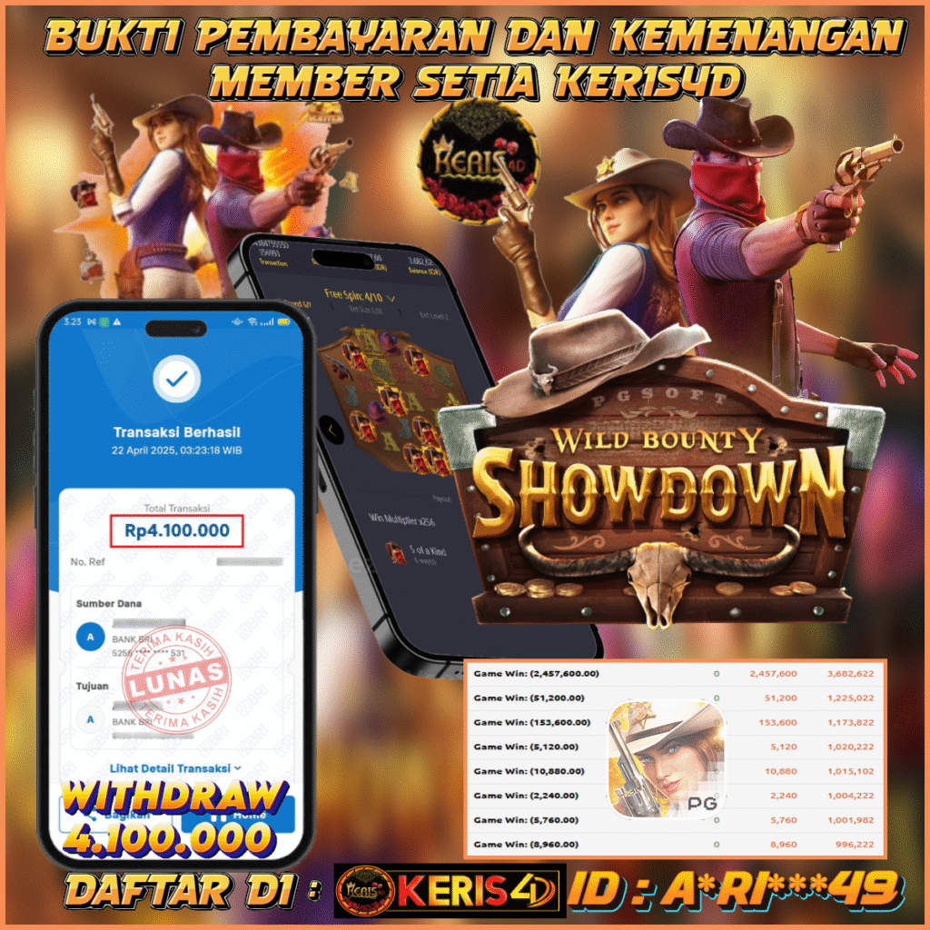 KERIS4D dikenal sebagai situs terpercaya yang selalu menghadirkan pengalaman bermain slot online yang aman, fair, dan berlisensi resmi. Di sini, kami tidak hanya sekadar memberikan janji, tapi bukti nyata berupa slip kemenangan yang dapat Anda lihat secara langsung.