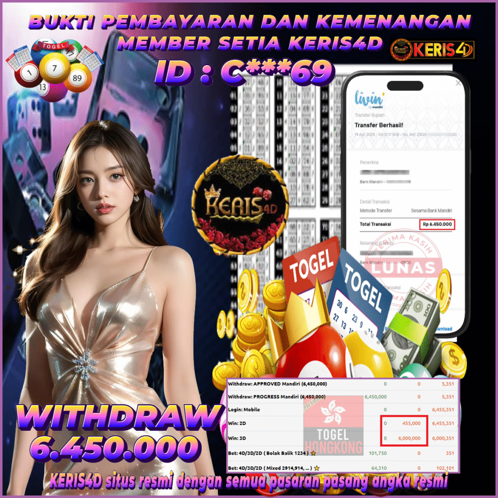 KERIS4D dikenal sebagai situs terpercaya yang selalu menghadirkan pengalaman bermain slot online yang aman, fair, dan berlisensi resmi. Di sini, kami tidak hanya sekadar memberikan janji, tapi bukti nyata berupa slip kemenangan yang dapat Anda lihat secara langsung.